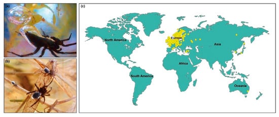- Seyyar, O.; Demir, H. Distribution and habitats of the water spider Argyroneta aquatica (Clerck, 1757) (Araneae, Cybaeidae) in Turkey. Arch. Biol. Sci. 2009, 61, 773–776. [Google Scholar] [CrossRef]