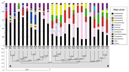 - Lozupone, C.A.; Hamady, M.; Kelley, S.T.; Knight, R. Quantitative and qualitative diversity measures lead to different insights into factors that structure microbial communities. Appl. Environ. Microbiol. 2007, 73, 1576–1585. [Google Scholar] [CrossRef] [PubMed]