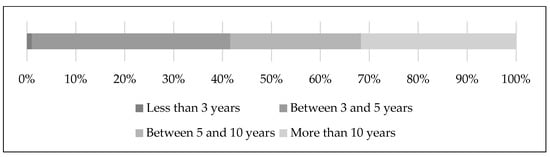 This innovative network implies the creation of new social links. The upper network (a) in Figure 2 shows the links among the most implicated people in AMB before the association was set up. The network at the bottom (b) in Figure 2 updates these links when the initiative is ongoing. The network is formed by 17 people and is based on the people making up the working group when data were collected (Table 1). In all, while the project was underway, 35% of existing links among stakeholders were conceived as the result of it being set up (red lines in Figure 1). This is also shown in Figure 3, where the segment including relations lasting 3–5 years is the most numerous one with almost 40% of relations.