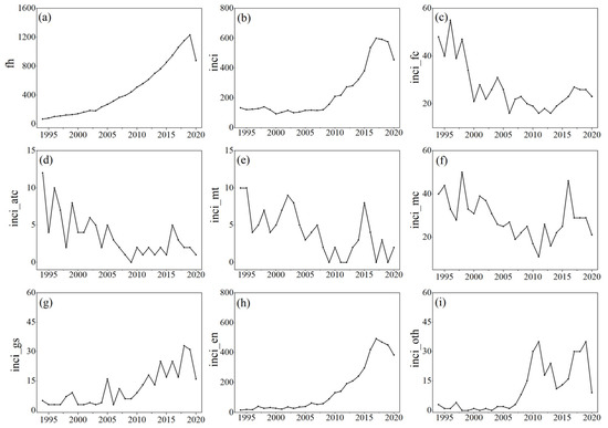 The time-series plots: (a) fh, (b) inci, (c) inci_fc, (d) inci_atc, (e) inci_mt, (f) inci_mc, (g) inci_gs, (h) inci_en and (i) inci_oth.