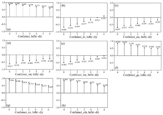 The cross-correlation diagrams: (a) Cor(lninci, lnfh(−d)), (b) Cor(lninci_fc, lnfh(−d)), (c) Cor(lninci_atc, lnfh(−d)), (d) Cor(lninci_mt, lnfh(−d)), (e) Cor(lninci_mc, lnfh(−d)), (f) Cor(lninci_gs, lnfh(−d)), (g) Cor(lninci_en, lnfh(−d)) and (h) Cor(lninci_oth, lnfh(−d)).