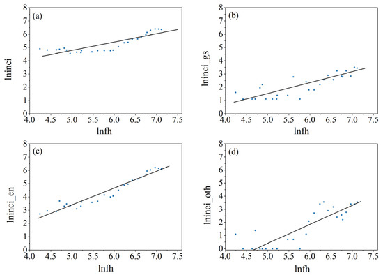 The scatter diagrams and regression lines: (a) (lninci, lnfh), (b) (lninci_gs, lnfh), (c) (lninci_en, lnfh) and (d) (lninci_oth, infh).