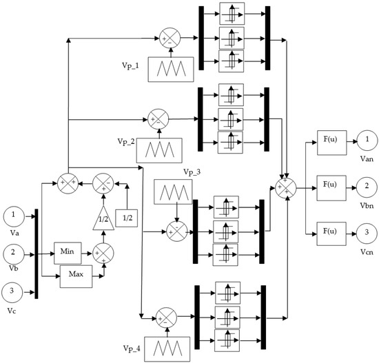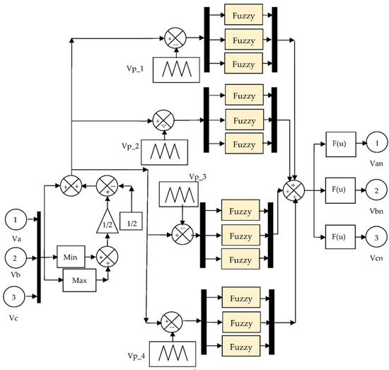 Traditionally, the SVM technique is among the most used methods for controlling reflectors and this is because of the results it offers compared to other methods such as the PWM technique [24]. In this method, the calculation of reference voltage and zones is relied upon, which makes this method more complicated, especially in the case of a multi-level inverter [25]. To overcome this problem, a new idea for this method was presented in [26], where the calculation of the maximum and minimum values of the three-phase feeding voltages was used in this proposed method. In this proposed method, the reference tension is not used or calculated as well as the regions where the reference tension is present. This proposed method in [26] is simpler and more intuitive compared to the classical SVM method. In this part, the proposed fuzzy SVM technique is used to control a five-level inverter for an asynchronous generator placed in a multi-turbine wind system. This proposed method of controlling a 5-level inverter is illustrated in Figure 4. The proposed method was used in [27] in order to give the five-level SVM technique.