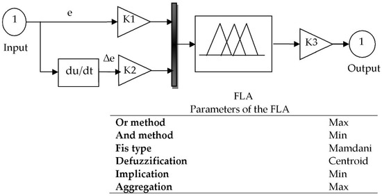 The internal form of the FLA method is shown in Figure 6. From this figure, it is noted that the structure of the FLA technique is simple. This fuzzy controller has two inputs, the error and the change in error, and only one output. Three constant gains (K1, K2, and K3) are used to improve the response and adjust the response of fuzzy logic. The characteristics of the FLA method used to improve the performance and effectiveness of the proposed five-level SVM technique are shown in the bottom of the Figure 6. The type of fuzzy controller used in this work is the Mamdani controller.