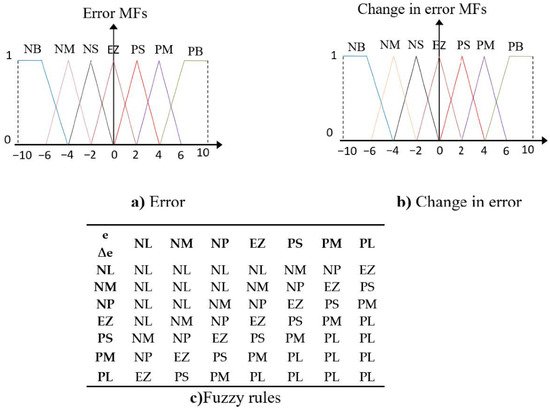 Seven membership functions (MFs) are used in the first entry (error) and seven MFs are used in the second input (change in error). These functions used to accomplish fuzzy logic are shown in Figure 7a,b. In order to get a good response and results for the fuzzy logic, the 7 × 7 rule is used, where these rules are represented in Figure 7c.