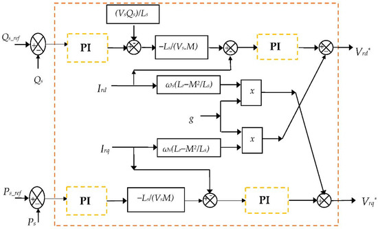 From Equations (21)–(25), the internal structure of the indirect FOC strategy can be given in Figure 9. Through this figure, we note that this technique controls the reactive and active power by controlling the quadrature and direct rotor voltages (Vqr* and Vdr*).