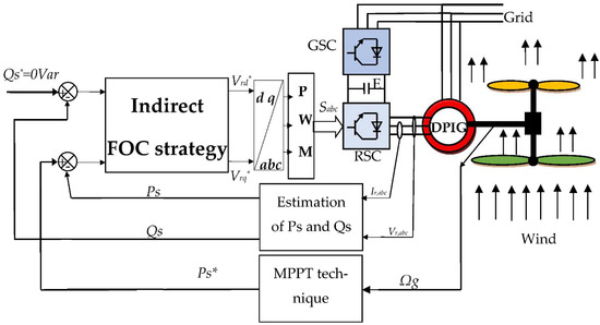 In this proposed indirect FOC method, the same equations used to estimate both the active and reactive power are used in the classical indirect FOC strategy. Therefore, it can be said that this designed indirect FOC strategy is more robust than the rest of the controls such as the classical indirect FOC strategy and DTC. The objective of this designed indirect FOC strategy is to obtain high-quality Vqr* and Vdr* from active and reactive power references for the inverter DPIG control. Controlling the latter very well leads to obtaining a high quality of stator current and active power. On the other hand, the reactive power reference is set to zero. As for the reference value of the active power, it is obtained using the maximum power point tracking (MPPT) technique. The system studied using the proposed indirect FOC method is represented in Figure 12, where almost the same structure as the classical indirect FOC method is preserved.