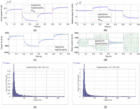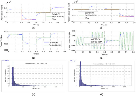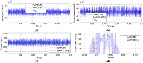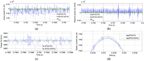 In this test, the behavior of the reference tracking is studied, for both the proposed IFOC-SSTA method and the classical IFOC method, where the obtained results are shown in Figure 13. Through this figure, the active and reactive power follow the references perfectly, and this is for the two IFOC methods with a preference for the proposed method in the dynamic response (see Figure 13a,b). The proposed IFOC-SSTA method gave better results in terms of ripples for both active and reactive power compared to the classical IFOC method (see Figure 14a,b). In Figure 13c, the generated torque has the same shape as the active power, where it can be seen that the increase in the active power corresponds to the increase in the torque. In addition, the proposed IFOC-SSTA method reduced torque ripples compared to the classical IFOC method (Figure 14c).