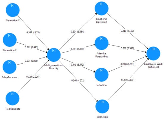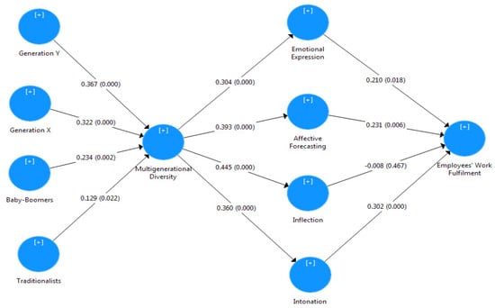 Figure 1 displays the loading values of each item of emotional communication and multigenerational diversity measurement, the path coefficient values, and the R-square values for the PLS algorithm model of emotional communication, multigenerational diversity, and work fulfilment of employees in the civil service. Figure 2 shows the PLS Bootstrapping Model with p-values and T-values for emotional communication, multigenerational diversity, and employee work fulfilment. Simultaneously, Figure 3 depicts the PLS Bootstrapping Model with t-statistics values for emotional communication, multigenerational diversity, and work fulfilment of employees. A bootstrapping study (i.e., the T-values and p-values) was performed to confirm the importance of the variables in the model, as shown in Figure 1, Figure 2 and Figure 3. Table 3 shows the path coefficient analysis, which shows the interaction impact among the variables in the model.