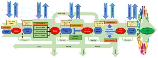 In this phase of the transformation, the specificities of the new normal are codified in the new social contract. These specificities are outcomes of discourses in varying scales and dimensions as well as in different knowledge and policy domains. The boycott efforts and spoiling strategies of status quo agents are no longer viable, as the stakes of non-cooperation are already too high to tolerate. Status quo or recalcitrant agents now acknowledge that transformational change is imminent, and that if they want to maintain relevance and certain privileges, they need to influence the design of new institutions and structures. Bargaining and policy games have become interconnected. This means that policies are now direct outcomes of bargaining between streams as opposed to policies reached behind closed doors by individual ministries with little to no public consultation. Bottom-up processes in governance are no longer the exception but the rule. Discourses unfold at the cognitive level, primarily to develop transformative narratives [56]. These narratives are important elements of the rhetorical structure that can help assess the sustainability transformation pathways being taken [57]. In cases of deviations, these narratives can help the process get back on track.