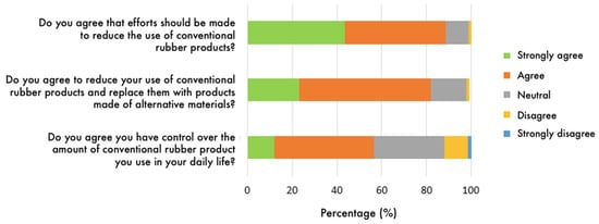 A 5-point Likert scale was used to assess respondents’ awareness of the effects of high rubber utilisation and pollution on the environment (Figure 5). The majority of respondents perceived excessive utilisation of synthetic rubber as a serious issue, with more than 80% agreeing or strongly agreeing that measures should be taken to reduce the amount of synthetic rubber used (Figure 5). Furthermore, more than 80% of respondents agreed or strongly agreed to minimise their use of conventional rubber products in favour of bio-based alternatives (Figure 5); this could be because they are aware that their choices can benefit the environment. These findings are consistent with a recent study conducted in Ireland and the Netherlands by Gaffey et al. [43], which found that a larger majority of consumers would prefer to buy bio-based products over fossil-based products. According to our correlation analysis, the ability to control the amount of rubber products used has no relationship with the readiness to reduce or replace synthetic rubber consumption.