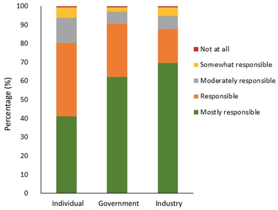 In order to understand public perceptions of the level of accountability of different actors, respondents were also asked to identify the level of responsibility for reducing the use of conventional products that cause environmental damage. The majority of respondents consider themselves to be “mostly responsible” and “responsible” in reducing their use of conventional products that harm the environment (Figure 9). A similar finding was reported in a survey study on bioplastics [54]; however, respondents in this study believed that the government and industry had larger roles to play, with the latter seen as the most responsible actor in managing the use of conventional products (Figure 9); this could be due to the fact that educational and awareness-raising measures or initiatives are frequently designed by the government or policymakers, whereas industries are the primary producers of conventional products such as rubber tyres and gloves.