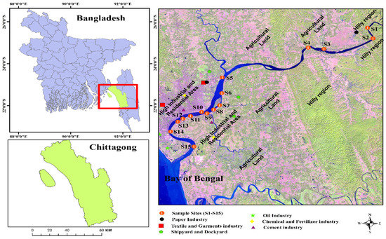 Karnaphuli River originates from the Lushai Hills in Mamit District, Mizoram state, India. The river passes through 180 km at Rangamati in Bangladesh and then runs about 170 km through the Chittagong port city which finally meets the Bay of Bengal [15,20]. The upstream of the Karnaphuli River flows through the hilly regions, the middle of the river is surrounded by mainly ghat and agricultural areas while the Chittagong Economic Zone (CEPZ) and different industries are located near the downstream. Geologically, the Karnaphuli River contains a deep layer of tertiary rocks which is covered with sedimentary deposits layers and overlying with mud and sand [28]. The maximum temperature during summer reaches 32.3 °C and the minimum temperature in winter is 13 °C. Annual rainfall in the area was about 3000 mm and approximately 95% of the rainfall happens within the months of May to September [28,29]. As it is the largest river in Chittagong City, that is why people of this city use the river water for different aspects like drinking and household purposes. For the convenient source of water, numerous industries have been developed along the river [2,15]. Among them, a large number of industries are mainly situated in the region between Kalurghat to Patenga, for this study most of the sampling sites were taken between these areas. As we collected water and sediment samples from the same sampling sites at the same time, we use Figure 1 from another published work by Hasan et al. [30].
