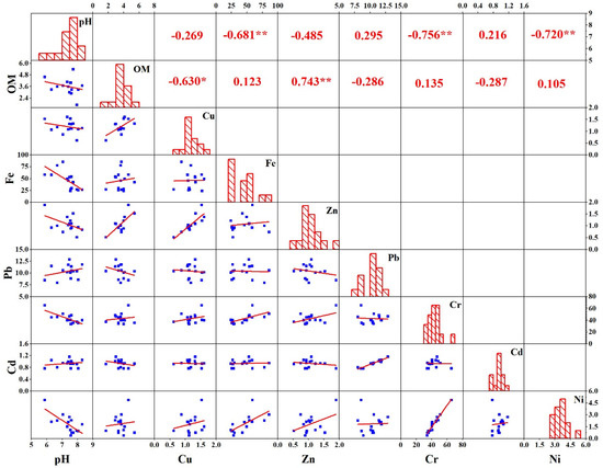 Figure 2 portrays the correlation of pH and OM with trace metals of sediment. The concentration of Cu, Fe, Ni, Cr, and Zn showed a negative correlation with pH values among them Fe, Ni, and Cr presented a significant negative correlation [50]. It indicates that pH may have potential effects on the distribution of these trace metals in the sediment of the river. For example, S11 and S12 had lower concentrations of Fe, Ni, and Cr due to the higher pH of sediment at these sites. There is a small positive correlation between Cd and Pb and pH, which is depicted in S8. Cu and Zn were powerfully correlated (p < 0.01 for Zn and p < 0.05 for Cu) with the OM content in the sediment. In contrast, Fe, Cr, and Ni were weakly correlated, presenting that the OM content in these sites powerfully controlled the distribution of Cu and Zn. The significant correlation between Cu and Zn and OM meant that the OM reduces the mobility of these heavy metals and is associated with their accumulation in sediment. These findings agreed with the results of Yohannes et al. [51]. The insignificant correlation of Cr, Ni, and Fe with organic matter depict that the mentioned trace metals might be less bioavailable in the sediments due to their remobilizing trend in the oxidizing state, whereas Pb and Cd show a weak negative correlation with OM which is supported by the results of Shehzad et al. [52].