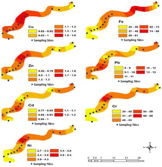 The spatial distribution of trace metals for all sites of Karnaphuli River is presented in Figure 3. The map illustrates the distribution of trace metals in the river, the highest concentrations are shown by the red color and the yellow color indicates the lowest concentrations.