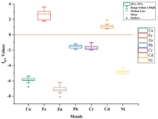 where Cn is the metal concentration level in the sediment, Bn is the background value of a given metal [39], and the factor 1.5 is used to account the possible variations in the background values. Muller [40] stated seven grades for the classification of the geo-accumulation index which are Igeo < 0 (uncontaminated); 0 < Igeo < 1 (uncontaminated to moderately uncontaminated); 1 < Igeo < 2 (moderately contaminated); 2 < Igeo < 3 (moderately to heavily contaminated); 3 < Igeo < 4 (heavily contaminated); 4 < Igeo < 5 (heavily to extremely contaminated); 5 < Igeo (extremely contaminated).