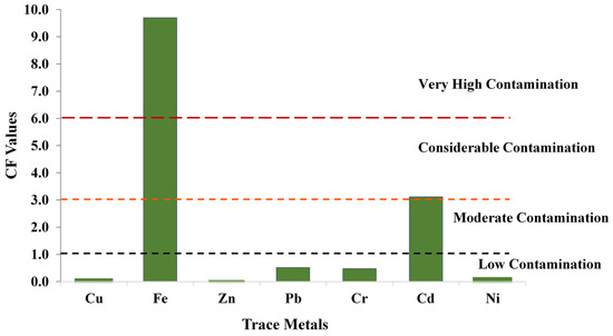 The sediment contamination level by metal is expressed as a contamination factor (CF) which is recommended by Hakanson [41] and calculated by Equation (3):