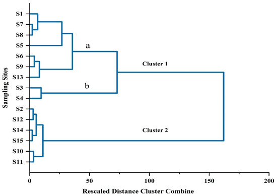 Different multivariate analyses such as cluster analysis (CA), Pearson correlation, and principal component analysis (PCA) were used for recognizing the sources of trace metals and interpreting their spatial variations. Cluster analysis (CA) was used to cluster similar sampling sites and to identify exact areas of contamination [57]. Figure 6 displays that all sampling sites on the river are classified into two statistically significant clusters. Cluster 1 contains two sub-clusters. Cluster 1(a) includes seven sites (S1, S5, S6, S7, S8, S9, S13) with the highest trace metal concentrations which are surrounded by semi-urban, commercial, power plant, port, and industrial areas. Cluster 1(b) consists of Sites S3 and S4 which had high metal concentrations because these sites are located near the Bazar and commercial area, where untreated wastewater and domestic sewage were discharged directly to the river. Cluster 2 includes sites (S2, S10, S11, S12, S14, S15) that are less effected compared to cluster 1.