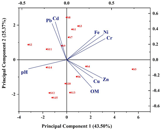 The first principal component (PC1) was dominated by Cr, Fe, and Ni, explaining 43.50% of the total variance. A strong correlation between Fe, Cr, and Ni shows that their major concentrations are entered into the environment through human-oriented activities. The source of Fe and Cr may possibly be the refining and steel industry, excessive use of ferrous sulfate fertilizers, leather industry, ship-breaking industries, and dockyards, as well as natural processes like weathering and erosion of iron-enriched rocks. Ni was released into the river from the battery and food processing industry [52]. The second component (PC2) consisted of Cd and Pb, accounting for 25.37% of the total variance. It supports the correlation analysis which was performed earlier. The sources of Cd and Pb would be the discharge of gasoline from boats, battery industries, power/desalination plants, electroplating and refining industries, and intensive use of cadmium fertilizers [52,64,65,66]. The third principal component (PC3) explained 18.31% of the total variation and was dominated by Cu, Zn, and OM. OM has a positive relation with Cu and Zn in Figure 2 which supports the PC3 results. The site scores from PC1 and PC2 show the same result observed in cluster analysis for the sites S1, S7, and S8 from cluster 1(a) and sites S10, S11, S12, S14, and S15 from cluster 2 which indicates the concentrations of trace metals in these sites may be from common anthropogenic sources. The concentrations of trace metals in S2, S3, S4, S5, S6, S9, and S13 are possibly from a mix of natural and anthropogenic sources.