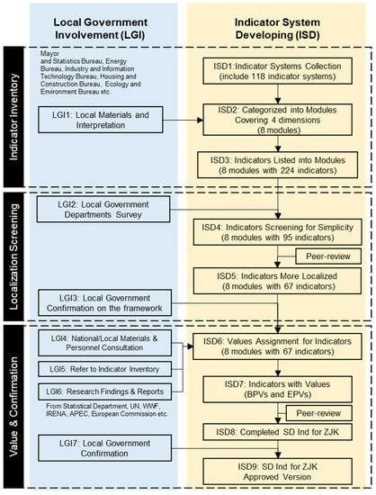 Localization screening was based on the applicability and accuracy requirements of the evaluation system and aimed to get a more localized indicator list. The local government was involved through a survey (box LGI 2 in Figure 2) and the indicators in each module would be analyzed. The indicators that do not meet the requirements will be removed. The result of localization screening (box ISD4 in Figure 2) needs to be peer-reviewed and confirmed by the local government.