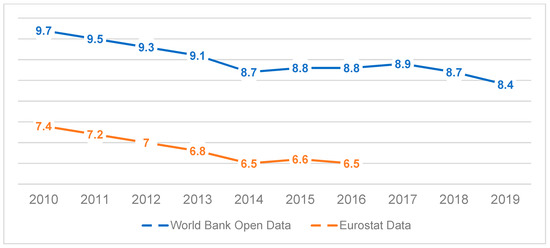 Such disagreement puts the authors in a relatively awkward position. Since the per capita carbon dioxide emission was the key indicator, it needed a reasonable EPV. The authors did a comparative study. According to research by Dadi Zhou [89] and Yongda He [90], per capita emissions of Hebei province should be below 9 tons by 2025, or close to current European Union levels. Public data from the World Bank [91] and Eurostat [92] showed that the current value should be below 8.4 tons (shown in Figure 3). Other researchers believed that China’s per capita carbon dioxide emission in 2025 would be between 7.3 to 8.3 tons [93,94].