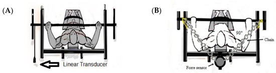 The static variables of force were rate of force development (RFD), maximum isometric force (MIF) (N), fatigue index (FI) (%) and time to MIF (time) (m/s), were determined by a Chronojump force sensor (Chronojump, BoscoSystem, Barcelona, Spain) [17], with a capacity of 500 kg, output impedance of 350 ± 3 ohm, insulation resistance greater than 2000 cc, input impedance 365 ± 5 ohm, analog converter 24-bit 80 Hz digital. The equipment was attached to the bench press, using Spider HMS Simond carabiners (Simmond, Chamonix, France), with a load of 21 kN, (Union Internationaledes Associations d’Alpinisme-UIAA). A steel chain with a load of 2300 kg was also used, used to fix the force sensor to the bench press. The distance from the force sensor to the center of the joint was used to determine torques and other values [18,28]. Maximum isometric strength (MIF) was determined by the maximum strength of the upper limbs, and an elbow angle close to 90 º was maintained, and at a distance of 15 cm from the bar to the chest. Athletes were instructed to make a single maximum movement (as fast as possible). The fatigue index (FI) was determined in the same way as the MIF, where the athletes maintained the maximum contraction for 5.0 s. The FI was calculated by the formula: FI = ((final MIF − initial MIF/final MIF) × 100). The RFD was calculated by the force/time ratio (RFD = Δ force/Δ time) [18,28]. The instruments used in the evaluations are shown in Figure 2.