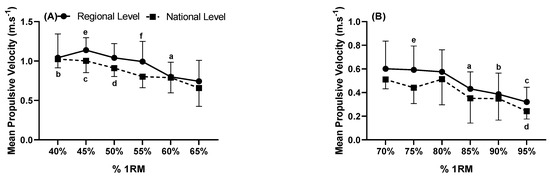 Mean propulsive velocity (m·s−1) measured from (A) mean propulsive velocity (m·s−1) measured from 40 to 65% of 1RM and (B) mean propulsive velocity (m·s−1) measured from 70 to 95% of 1RM in national and regional levels. (A): a: Indicates difference in RL between 60% compared to 45% (p = 0.043) and 50% 1RM (p = 0.041); b: Indicates differences in NL between 40% compared to 55% (p = 0.001), 60% (p = 0.005) and 65% 1RM (p = 0.002); c: Indicates differences in NL between 45% compared to 55%, 60% and 65% 1RM (p < 0.001); d: Indicates differences in NL between 50% compared to 55% (p = 0.030) and 65% 1RM (p = 0.016); e: Indicates differences in percentage 45% between RL and NL (p = 0.041); f: Indicates differences in percentage 55% between RL and NL (p = 0.047). The value of F = 19.119, and η2p = 0.705 was very high effect (IntraClass) and F = 1.104, and η2p = 0.121 medium effect (InterClass). (B): a: Indicates difference in RL between 85% compared to 75% 1RM (p = 0.039); b: Indicates differences in RL between 90% compared to 75% (p = 0.031), 80% 1RM (p = 0.023); c: Indicates differences in RL between 95% versus 70% (p = 0.005), 75% (p = 0.005), 80% 1RM (p = 0.004), and 85% 1RM (p = 0.023); d: Indicates differences in NL between 95% versus 70% (p < 0.001), 75% (p = 0.004) and 80% 1RM (p = 0.036); e: Indicates differences in the percentage 75% between RL and NL (p = 0.020). The value of F = 25.224, and η2p = 0.759 was very high effect (IntraClass) and F = 1.606, and η2p = 0.167 medium effect (InterClass).
