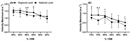 Maximum velocity (m·s−1) measured from (A) maximum velocity (m·s−1) measured from 40 to 65% of 1RM and (B) maximum velocity (m·s−1) measured from 70 to 95% of 1RM in national and regional levels. (A): a: Indicates difference in RL between 60% compared to 50% 1RM (p = 0.030); b: Indicates differences in NL between 40% versus 50% (p = 0.020), 55% (p < 0.001) and 65% 1RM (p = 0.008); c: Indicates differences in NL between 45% compared to 55 and 65% (p < 0.001), and 60% 1RM (p = 0.007); d: Indicates differences in percentage 50% between RL and NL (p = 0.041); e: Indicates differences in percentage 55% between RL and NL (p = 0.049). The value of F = 20.390, and η2p = 0.718 was very high effect (IntraClass) and F = 1.087, and η2p = 0.120 medium effect (InterClass). (B): a: Indicates difference in RL between 70% compared to 95% 1RM (p = 0.008); b: Indicates differences in RL between 75% compared to 85% (p = 0029) and 95% 1RM (p = 0.016); c: Indicates differences in RL between 80% compared to 90% (p = 0.019) and 95% 1RM (p = 0.001); d: Indicates differences in NL between 95% versus 70% (p < 0.001), 75% (p = 0.006) and 80% 1RM (p = 0.041); e: Indicates differences in percentage 75% between RL and NL (p = 0.013); f: Indicates differences in the percentage 95% between RL and NL (p = 0.040). The value of F = 17.916, and η2p = 0.691 very high effect (IntraClass), and F = 1.302, and η2p = 0.140 medium effect (InterClass).