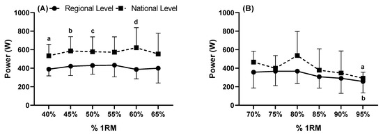 Power (W) measured from (A) power (W) measured from 40 to 65% of 1Re (B) power (W) measured from 70 to 95% of 1RM in national and regional level. (A): a: Indicates differences in percentage 40% between RL and NL (p = 0.004); b: Indicates differences in percentage 45% between RL and NL (p = 0.004); c: Indicates differences in percentage 50% between RL and NL (p = 0.023); d: Indicates differences in percentage 60% between RL and NL (p = 0.032). The value of F = 7.254, and η2p = 0.476 was high effect (InterClass). (B): a: Indicates differences in RL between 95% compared to 70% (p = 0.038), 75% (p = 0.049) and 80% 1RM (p = 0.004); b: Indicates differences in NL between 95% compared to 70% 1RM (p = 0.007). The value of F = 7.218, and η2p = 0.474 was high effect (IntraClass).