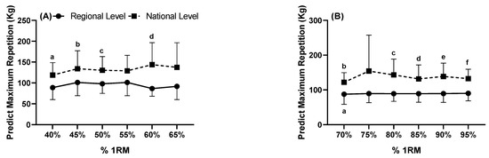 Maximum predicted repetition (kg) measured from (A) maximum predicted repetition (kg) measured from 40 to 65% of 1RM and (B) maximum predicted repetition (kg) measured from 70 to 95% of 1RM in national and regional level. (A): a: Indicates differences in percentage 40% between RL and NL (p = 0.009); b: Indicates differences in percentage 45% between RL and NL (p = 0.016); c: Indicates differences in percentage 50% between RL and NL (p = 0013); d: Indicates differences in percentage 60% between RL and NL (p = 0.021). The value of F = 8.653, and η2p = 0.520 was very high effect (InterClass). (B): a: Indicates differences in NL between 95% compared to 70% 1RM (p = 0.007); b: Indicates differences in the percentage 70% between RL and NL (p = 0.046); c: Indicates differences in the percentage 80% between RL and NL (p = 0.016); d: Indicates differences in percentage 85% between RL and NL (p = 0.021); e: Indicates differences in the percentage 90% between RL and NL (p = 0.013); f: Indicates differences in the percentage 95% between RL and NL (p = 0.007). The value of F = 10.741, and η2p = 0.573 was very high effect (IntraClass) and F = 0.594, and η2p = 0.069 medium effect (InterClass).