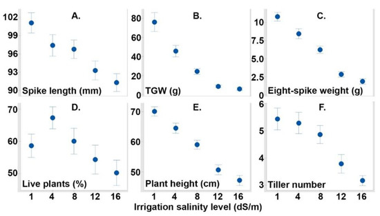 Wheat is a moderately salt-tolerant crop with a salinity threshold of 7.1 dS m−1 [21,22]. Effects of salinity stress on wheat growth, development, and grain yield have been extensively studied, but the knowledge about relative salt tolerance of wheat grains and the effect of salinity on grain quality is still limited [17]. However, studies [15,23] indicated that 7.5 and 15 dS m−1 salinity adversely affected yield, grain weight, spike length, number of grains, and grain filling of six wheat genotypes (9476, SARC-1, SARC-7, SARC-8, Bhakhar, and Saher 2000). Similarly, it was found that 15 dS m−1 salinity significantly reduced yield, yield components (particularly number of tillers and grain weight per plant), protein percentage, fat, and fiber contents of grains of the genotype Pasban-90 [17].