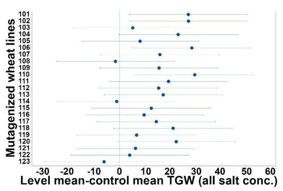 The difference in grams between each mutagenized line (101–123) and the BARI Gom−25 control in TGW summed for all plots subjected to 1–16 dS m−1 salinity treatments. The control mean was set to 0, as shown by the vertical line.