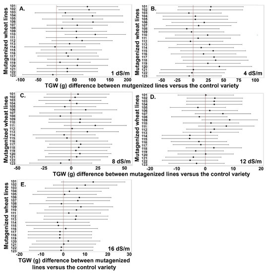 The difference in gram between each mutagenized line (101−123) and the BARI Gom−25 control in TGW under the 1 dS m−1 (A), 4 dS m−1 (B), 8 dS m−1 (C), 12 dS m−1 (D), and 16 dS m−1 (E) salinity treatments. The control mean is set to 0, as shown by the vertical lines in the graphs.