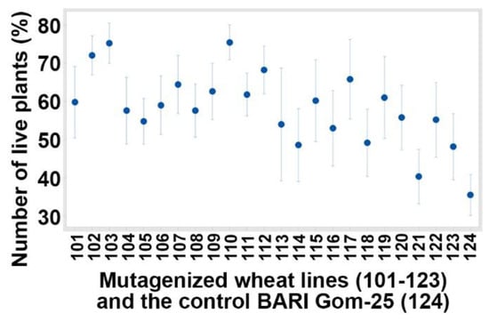 There were at least 10 cm spacings between the plants to avoid strong inter-plant competition. Thus, the loss of live plants from salinity stress should have had a limited effect on the growth of neighboring plants and, hence, the TGW. However, it should be noted that the percentage of live plants was lowest for the BARI Gom-25 control (35.60 ± 2.58%; Figure 4), which had a correspondingly low TGW (Figure 2 and Figure 3).
