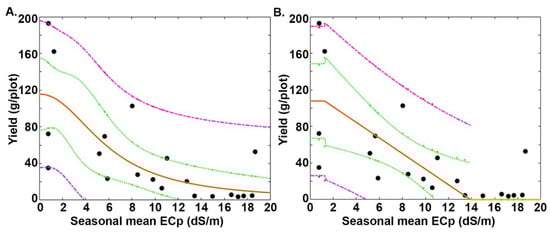 Salinity tolerance is traditionally described using the model developed by Maas and Hoffman [30]. This model is often evaluated by a two-step linear regression of salinity versus (usually relative) yield. The first part of the resulting graph is flat until a threshold value is reached, then yield starts to decline as salinity increases. The key salt tolerance parameters are the salinity threshold (often expressed as ECpthr: electric conductivity of pore water) and the decline’s absolute or relative slope (S or S%). In addition, in field experiments where it is impossible to expose plants to zero salinity, the zero-observed-effect yield (Y0) must be estimated. A second common model is the S-shaped curve, described by [31], with two parameters: the soil salinity at which the yield is 50% of Y0 (ECp50) and a dimensionless slope parameter (p) describing the curvature. An advanced procedure for estimating parameters of these models was developed by [32], who focused on uncertainties of the estimates and advocated for the use of the EC90 value (the salinity at which the yield is 90% of Y0) as a more agronomically relevant parameter.