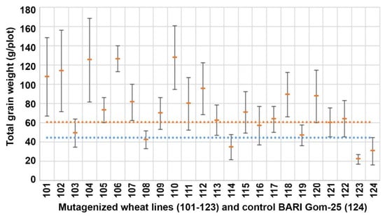 Zero-observed-effect yield (Y0) estimates obtained from the Maas–Hoffman model for the mutagenized wheat lines (101–123) and BARI Gom−25 control (line 124). Total grain weight (TGW) per plot at estimated Y0 is shown for all mutagenized lines and the control. The blue and red dotted lines, respectively, indicate the upper limit for the BARI Gom-25 control (line 124) and double this TGW.