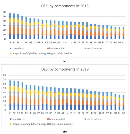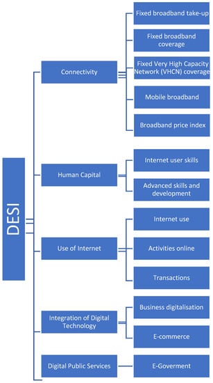 37]. The five basic pillars of the DESI (Digital Economy and Society Index) are: connectivity, human capital, internet use, technology integration, and digital public services (