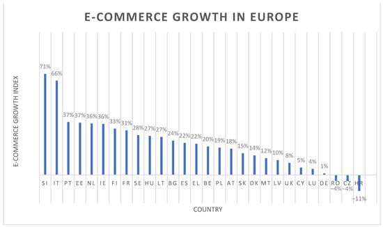 Figure 1). E-Commerce has a 40% share of the structure of the technology integration index, with the remaining 60% representing the indicator of business digitization. Between 2015 and 2019, the popularity of e-Commerce spread to almost all European countries, except Romania, the Czech Republic, and Croatia (
