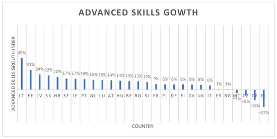 Advanced skills and development, the second basic variable in the analysis, is also a composite index. This index includes several dimensions relevant to our study. The first dimension consists of the number of employees in the ICT field. Knowledge in the field of ICT makes employees more attractive in the labor market, given the context of digital transformation in which the world economy is engaged. Another important indicator included in the index is the number of women employed in the field of ICT. This indicator can be seen to demonstrate reducing discrimination towards the integration of women in technical fields and providing the opportunity for women to work remotely, so they no longer fall into the category of discouraged human capital. The last component of the index refers to the number of graduates of studies in ICT-related fields. This component is essential for the labor market, especially to increase the employment ratewithin the labor market.
