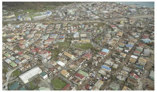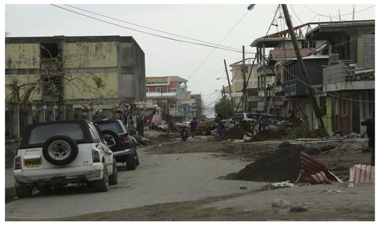Dominica, like other SIDS in the Caribbean, has had a long history with extreme weather events. The two most significant storms that made landfall during the last 20 years were Tropical Storm Erika in 2015 and Hurricane Maria in 2017. While Dominica experienced other significant storms in the 2000s such as Hurricane Dean in 2007, Tropical Storm Erika represented the most devastating storm since Hurricane David in 1979, which took the lives of at least 31 people [1]. Damage from Tropical Storm Erika represented approximately 90% of Dominica’s 2015 gross domestic product (GDP), or US $483 million; additionally, heavy rainfall, flooding and landslides left 30 people dead and displaced thousands [2,3]. Just two years later, Hurricane Maria was even more catastrophic (see Figure 1 and Figure 2 below)—damage from the hurricane represented 226% of Dominica’s GDP, or US $1.313 billion, and affected every individual resident of the island in some way [4,5]. An estimated 80% of the population (approximately 56,800 people) was impacted directly; over 90% of homes were damaged or destroyed, and 65 lives were lost [5]. Hurricane Maria is now seen as the most profoundly devastating disaster in global history in terms of percentage of GDP in loss and damage [5].
