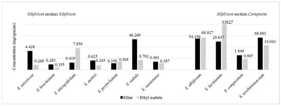 - Davidyants, E.S.; Abubakirov, N.K. Chimičeskij sostav i perspektivy ispol’zowaniya rasteniy r. Silphium L. Rastit. Resur. 1992, 28, 118–128. [Google Scholar]