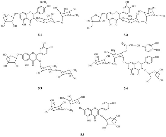 | Quercetin 3–O–β–L–galactosyl (1′″→6″)–O–β–D–rhamnopyranoside 7–O–α–L–apiofuranoside | + | ||||||||||