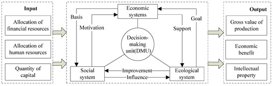 The primary task of environmental protection enterprises is to create a healthy living and working environment. Only by the coordinated development of economy, society, and environment can a virtuous circle of sustainable development be achieved. Based on the view of the input–output effect, the economic, social, and environmental dimensions are considered in this paper. The theoretical framework of the input–output index of innovation efficiency is constructed, which is shown in Figure 2. The DMU represents the object of innovation efficiency evaluation in Figure 2, which is represented by a specific sample enterprise in this paper. On this basis of the theoretical framework, the evaluation index system of innovation efficiency of environmental protection enterprises is established, and the specific indexes are shown in Table 1.