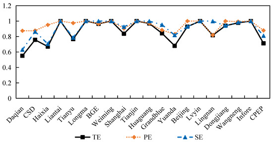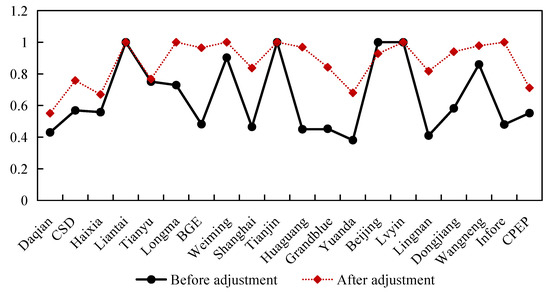 After calculation, the mean of comprehensive technical efficiency (TE), pure technical efficiency (PE), and scale efficiency (SE) of environmental protection enterprises before adjustment are 0.653, 0.865, and 0.754, respectively, which indicate that there are still gaps of 34.7%, 13.5%, and 24.6% from the frontier of efficiency, respectively. The innovation-driven development performance of most environmental protection enterprises is below the efficiency frontier, which indicates that increasing the input cost of innovation-driven solutions in environmental protection enterprises in the short term cannot give full play to the drive effect. Thus, it can be seen that there is still much room to drive the development of environmental protection enterprises before adjustment.