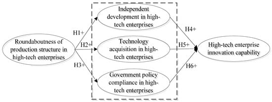 Independent development in high-tech enterprises means that enterprises rely on their own strength and resources to carry out original innovation and high-tech research. The roundaboutness of production structure in high-tech enterprises plays an important role in promoting the independent development of enterprise technology. The roundaboutness of production structure can accelerate the technological progress of enterprises, provide certain internal power for the absorption of technology within the organization, and realize an increase of economic benefits [32]. When the roundaboutness of the whole production structure promotes the further refinement of the division of labor in the value chain, and the enterprise’s internal production complexity increases, and it need to carry out independent innovation to fit the changed structure. Under the influence of the roundaboutness of production structure, enterprises tend to obtain stable technological innovation output, and they have the motivation to carry out independent technological development. Therefore, this paper proposes the following hypothesis: