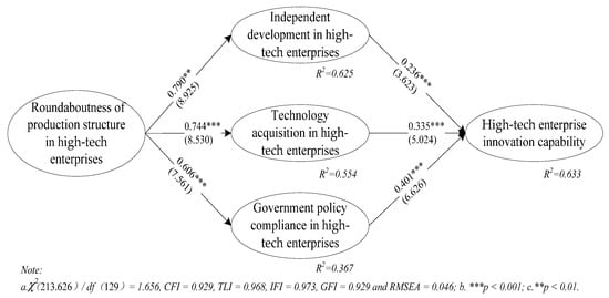 To test the hypotheses proposed in this study, AMOS 21.0 was used to build a structural equation model. The model fit, standardized correlation coefficient and significance are shown in Figure 2. The results show that the roundaboutness of production structure in high-tech enterprises has a significant positive impact on their independent development (), technology acquisition (), and government policy compliance (), supporting hypotheses H1, H2, and H3. Meanwhile, high-tech enterprise innovation capability is positively driven by its independent development (), technology acquisition () and government policy compliance (), which supports hypotheses H4, H5 and H6.