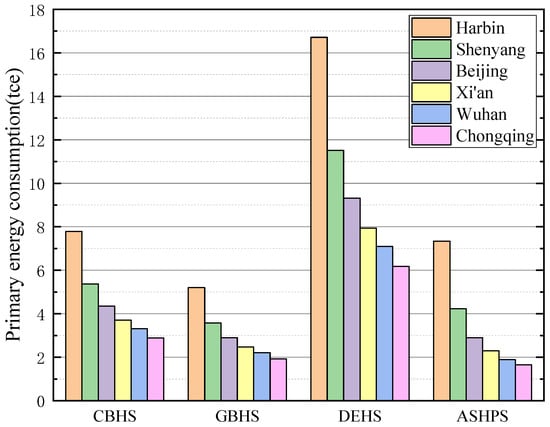 - The PEC of GBHS and ASHPS is obviously lower than that of CBHS, with a decrease of about 33% and 6–43%, respectively. The PEC of DEHS is higher than that of CBHS, with an increase of about 115%.