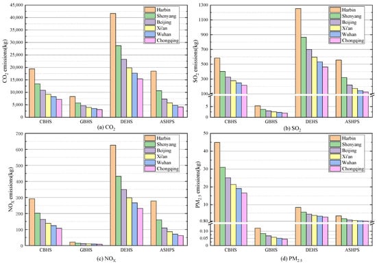 - Compared with CBHS, GBHS and ASHPS can reduce the emissions of the pollutants effectively, and the emissions, such as CO2, SO2, NOX, and PM2.5, can reduce by about 57–99% by using GBHS for the six typical cities. By using ASHPS, these emissions can reduce by about 5–93%, 33–95%, and 42–95% for the severe cold regions, the cold regions and the hot summer and cold winter regions, respectively. DEHS cannot reduce PM2.5 emission effectively, but increases the emissions of CO2, SO2, and NOX significantly.
