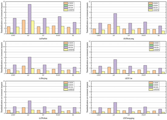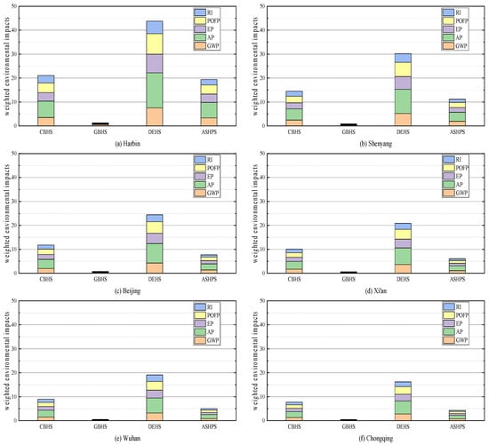 - The weighted EMP of DEHS is the largest and that of GBHS is the smallest. The weighted EMP of GBHS is about 6% of CBHS for all six typical cities. The weighted EMP of ASHPS is 92%, 77%, 65%, 60%, 56%, and 56% of CBHS for Harbin, Shenyang, Beijing, Xi’an, Wuhan, and Chongqing, respectively. The weighted EMP of DEHS is about 108% higher than that of CBHS for all six typical cities.