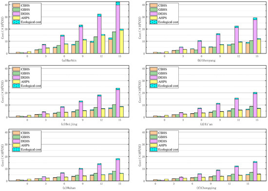 - The life cycle cost of GBHS is about 33% higher than that of CBHS for the six typical cities. The life cycle cost of ASHPS is about 33–57% higher than CBHS for the severe cold region, but not much different or even less than CBHS for the cold region and hot-summer and cold-winter region. The life cycle cost of DEHS is increased by 194–230% compared with that of CBHS.